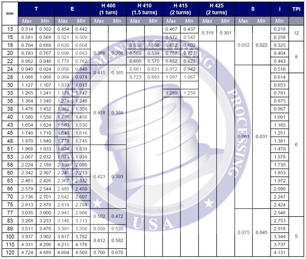 The T and E dimensions are calculated as the average of two measurements taken across the major and minor axes. Limits for ovality (out-of-roundness) are to be agreed upon between the container supplier and customer as needed. The H dimension is measured from the top of the neck finish to the intersection point where the diameter T (extended downward parallel to the bottle centerline) meets the bead or shoulder. Unless otherwise specified, the minimum I dimension applies across the full length of the bottle opening. Concentricity (alignment) of the minimum I dimension relative to the T and E diameters is not specified in the standard. The I min is intended primarily for accommodating filler tubes. A minimum of one full turn of thread must be present. Careful consideration should be given to the sealing surface width to ensure compatibility with the chosen sealing system.